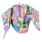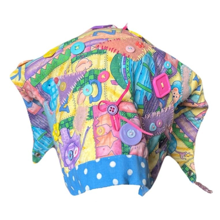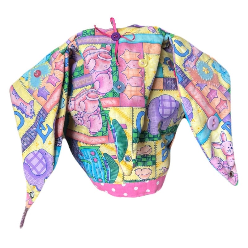 Made with a thrifted baby blankie, super cute print + some ribbon and button details
