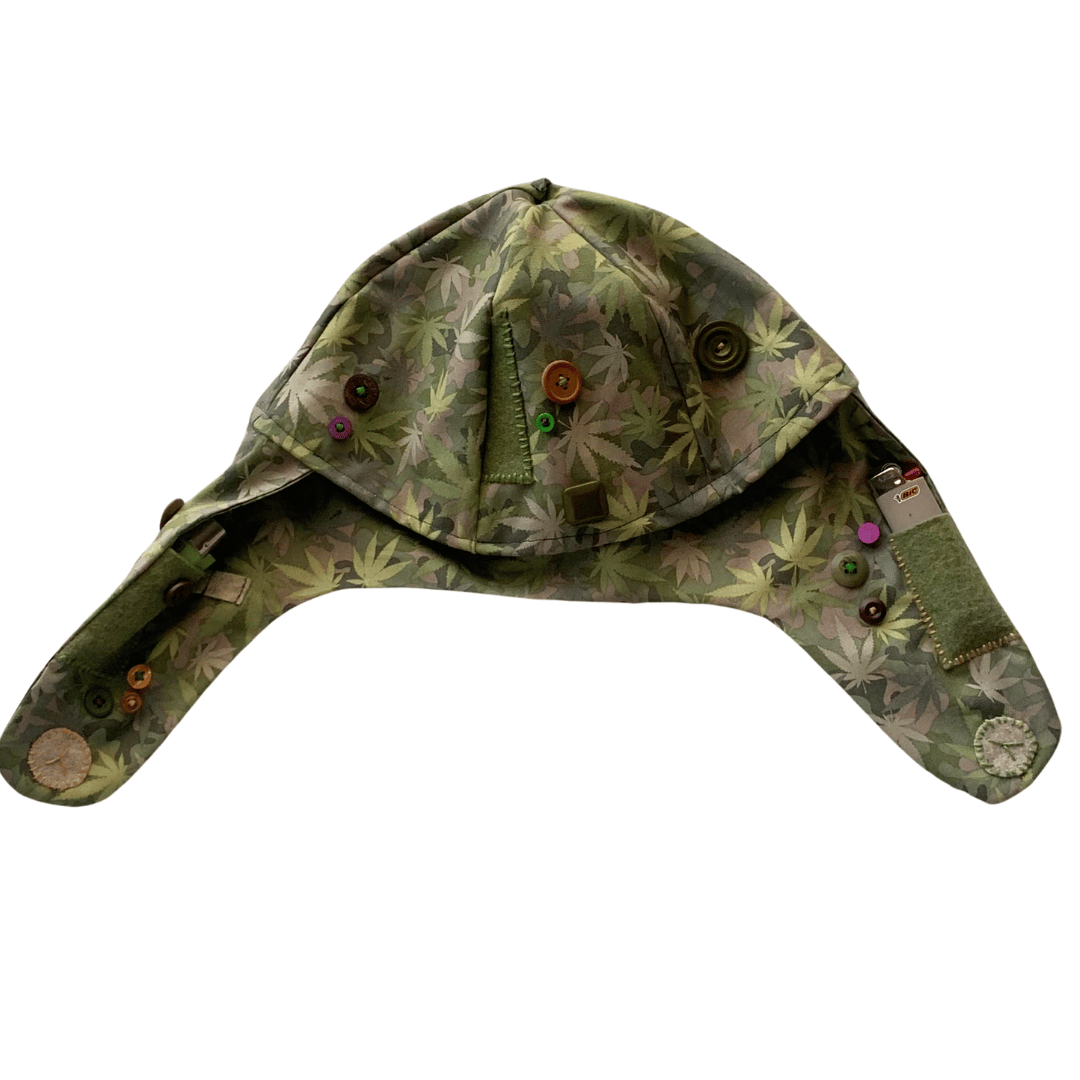 Hat dedicated to gardening. Includes utility pockets and loops for your gardening needs. Decorated with various buttons. and hand-sewn felt patches.