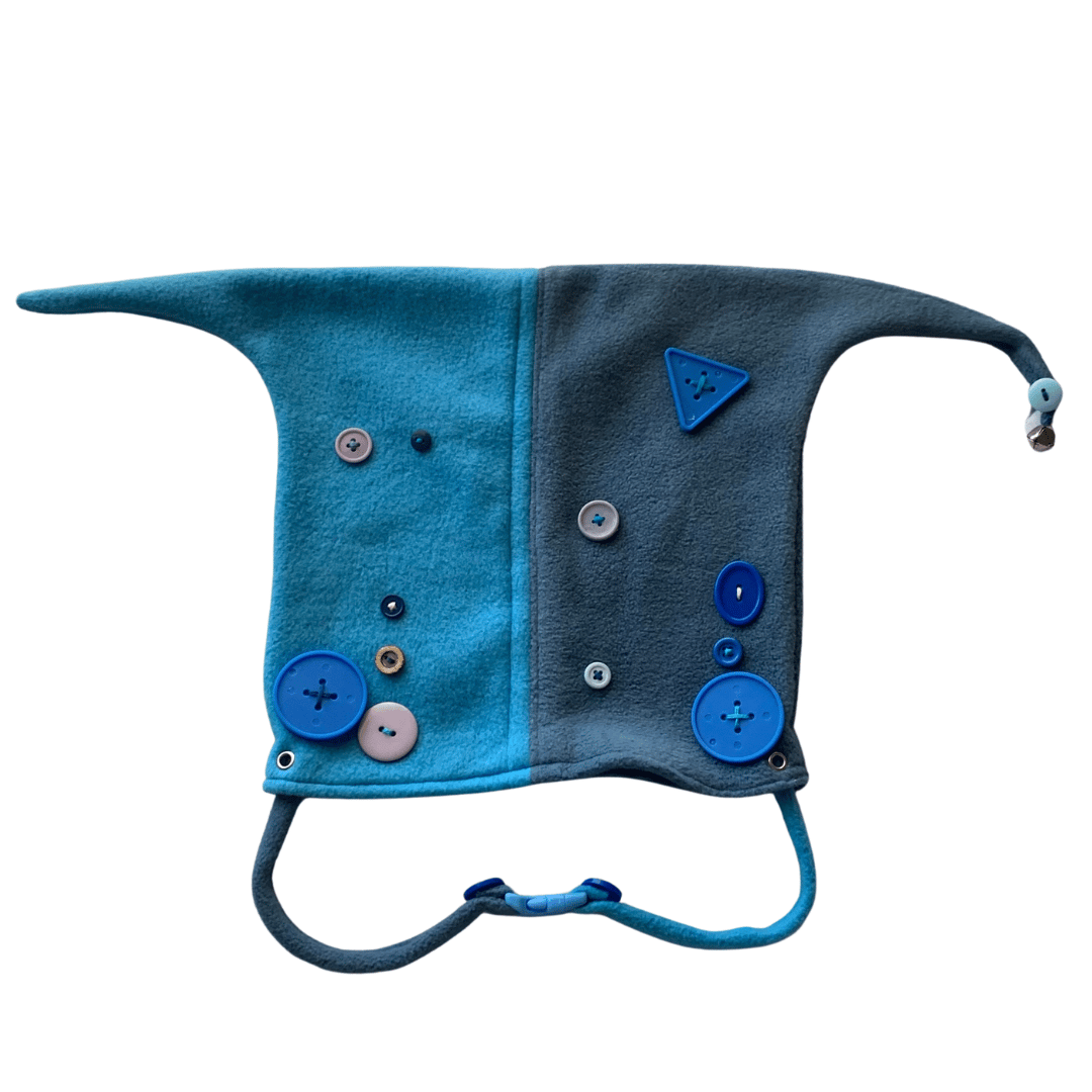 Blue troll hat, the colors remind me of Sportacus from Lazy Town! Decorated with various buttons, has a jingle bell on one side, as well as buckle straps.